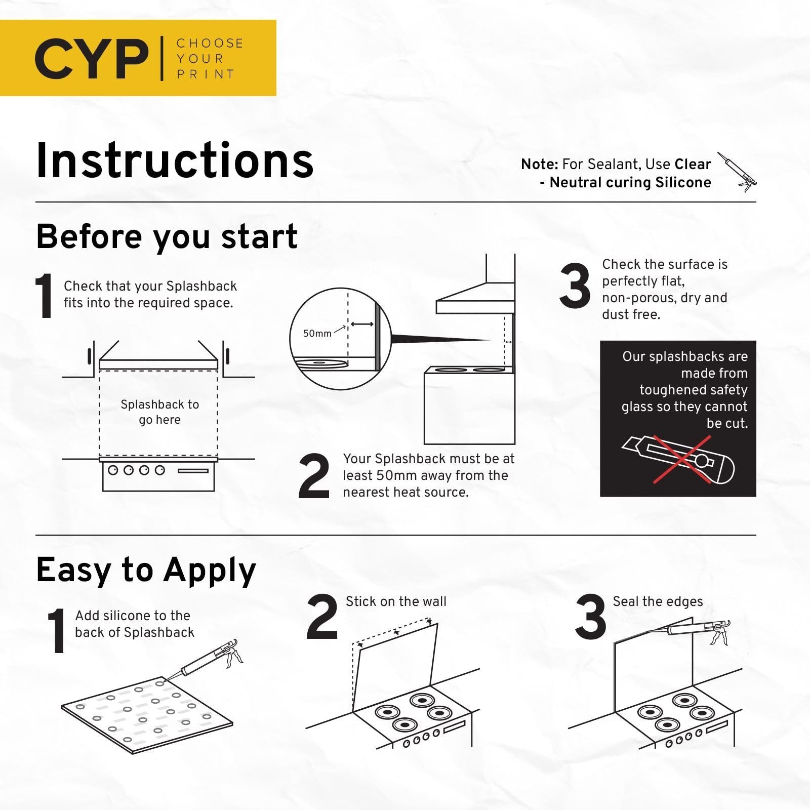 Installing our splashback couldn't be easier - simply follow the easy-to-use instructions included in every package and attach it to your wall with a strong adhesive. Before you know it, your kitchen will be transformed into a beautiful and practical space that is as easy to clean as it is stylish.